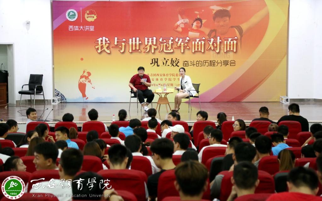 巩立姣(台上左一)与我院师生分享自己的奋斗历程