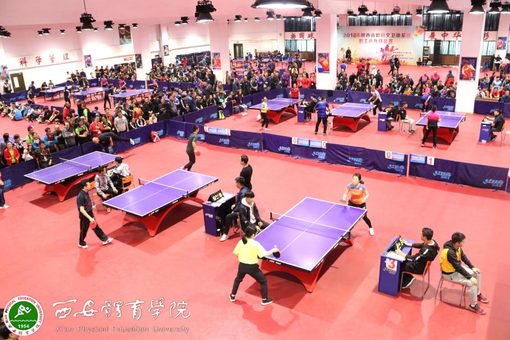 本网讯 10月27至28日,2018陕西省教科文卫体系统职工乒乓球赛在我院乒乓球馆举行。本次比赛由省教科文卫体工会主办,我院承办,共有来自全省的60余支代表队参赛,运动员、教练员、裁判员等近千人。各代表队通过分组循环赛和单淘汰赛两个阶段进行角逐。
