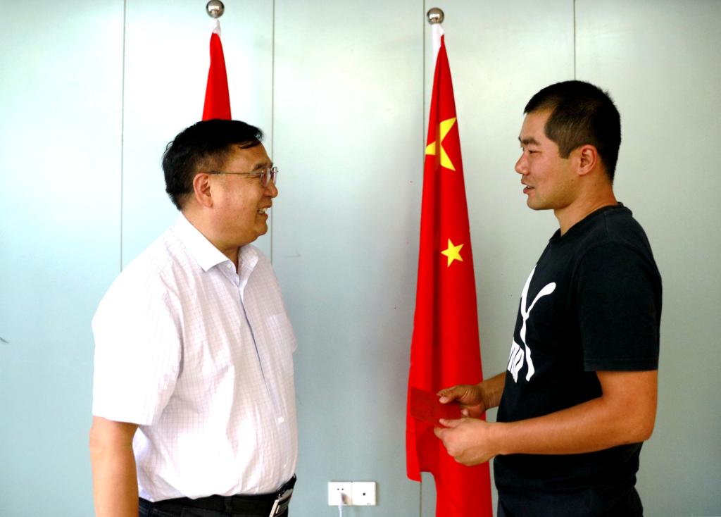 刘宝平(左)向beat365教师代表李金(右)送予教师节慰问金
