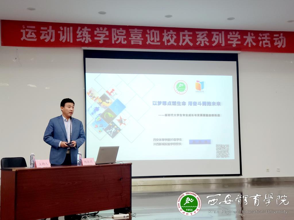 9月18日下午,运动训练学院邀请了我院95级校友、陕西省教学能手、西咸新区沣西实验学校校长杨振德在五楼报告厅为师生做了题为《新时代大学生专业成长与发展面临的新机遇》的专题讲座。讲座由运动训练学院党委书记王鑫主持。