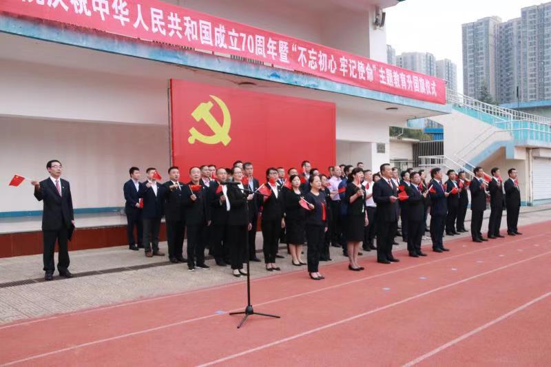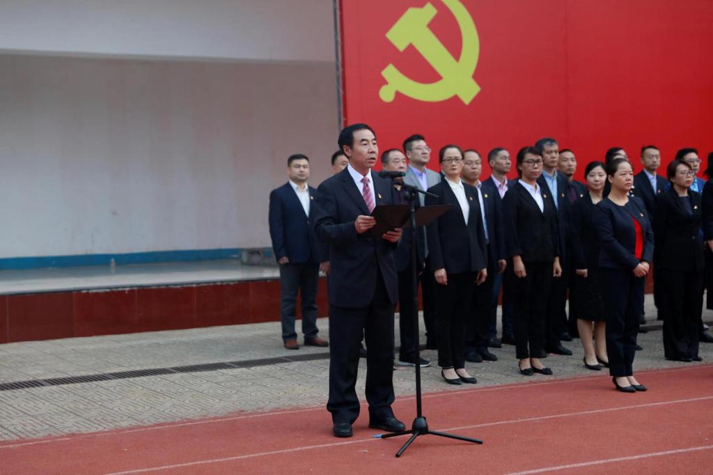 上午7时,仪式正式开始。12名护旗队员护送鲜艳的五星红旗迈着坚实雄健的步伐,精神抖擞地将国旗护送至升旗台。伴随着雄壮的国歌和第一缕晨曦,五星红旗冉冉升起,全体师生高唱国歌,肃穆行举手礼,向祖国表达最崇高的敬意。之后,由党委副书记刘子实领誓,全体党委委员、全校师生员工党员代表和近两年入党的党员面向党旗庄严宣誓,重温入党誓词。