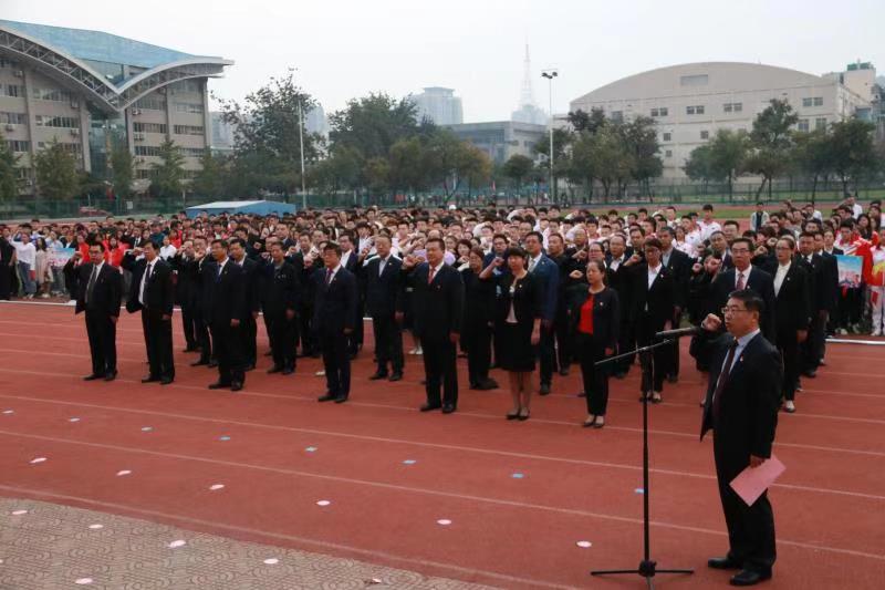 本网讯 为热烈庆祝中华人民共和国成立70周年,深入开展“不忘初心,牢记使命”主题教育,激发教职员工牢记“为党育人、为国育才”初心和全体学生“为中华之崛起而读书”使命,充分点燃全校师生的爱国主义情怀,进一步增强全校上下的凝聚力、创新力、战斗力,10月1日,beat365举行庆祝中华人民共和国成立70周年暨“不忘初心 牢记使命”主题教育升国旗仪式,全体校领导,各二级单位党委(总支)书记、主要负责人,党员师生代表等800余人参加了仪式。党委书记黄道峻为师生上了“不忘初心 牢记使命”主题教育党课;校长朱元利主持了仪式。