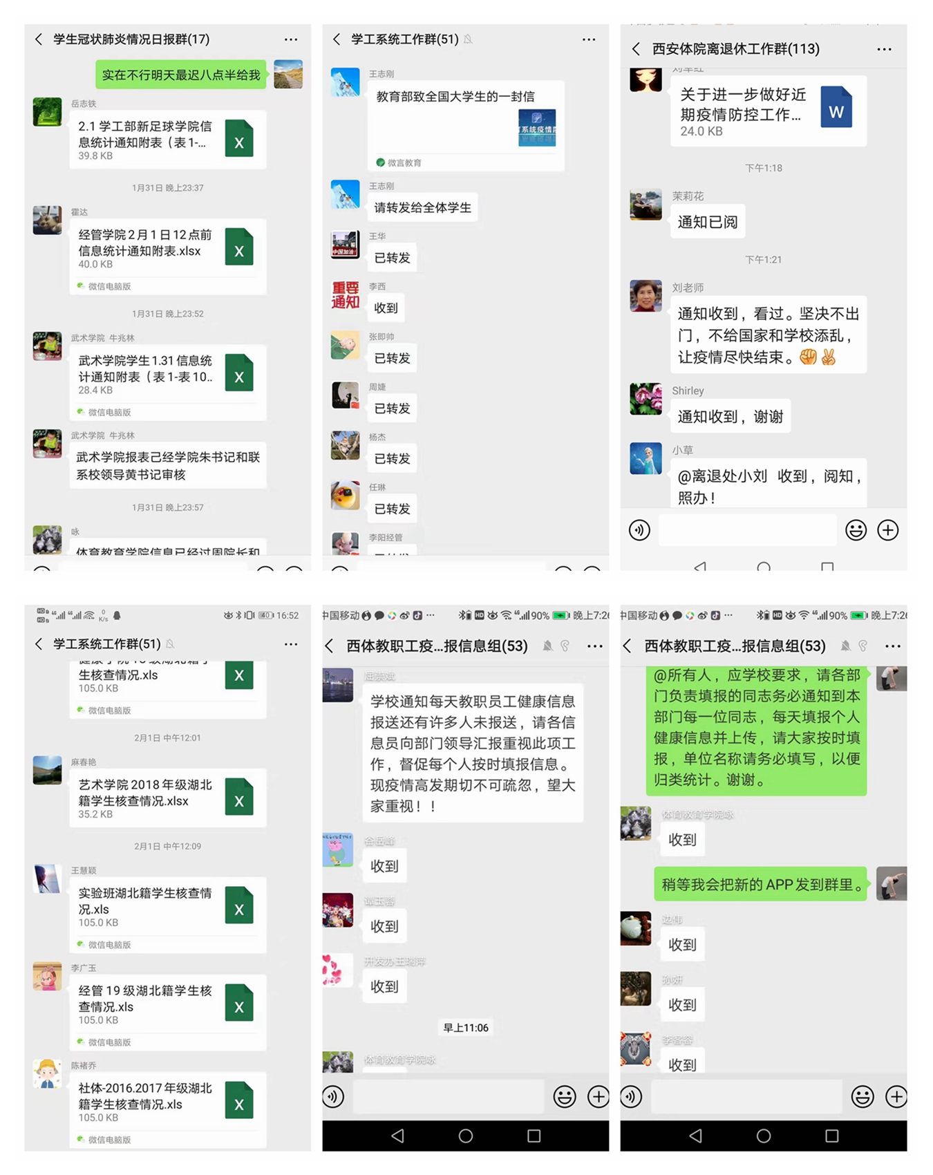 在校教职工与离退休人员,除了微信交流外,信息组的工作人员有时还得打电话,甚至“登门拜访”。据悉,有的离退休老同志年龄大,不会使用微信,只能打电话确认他们的情况,为“不漏一户、不漏一人”,学校为家属楼各个单元设立了临时楼长,挨家挨户传达学校的文件精神。信息组的工作人员每天面对大量信息,必须耐心细致,因为一个信息发生错误,就有可能影响到某位教职工或是学生,处理好每一条信息,就是为每一位教职工与学生负责。信息组的工作人员在介绍自己承担的具体工作时说到,参与学校防控疫情的每一位工作人员都值得尊敬和点赞,虽然工作内容不同,但责任都是一样的——为beat365战“疫”做出贡献。