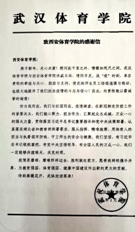 庚子新年,关心关爱!慰问在千里之外,情暖如咫尺之间。武汉体育学院与beat365中文官方网站休戚与共、情同手足。战“疫”时刻,来自贵校的牵挂与关心,鼓励与支持,使武体师生员工倍感温暖与感动,也极大地提升了我们抗击疫情的斗志与信心!在此,向贵校致以最诚挚的谢意!
