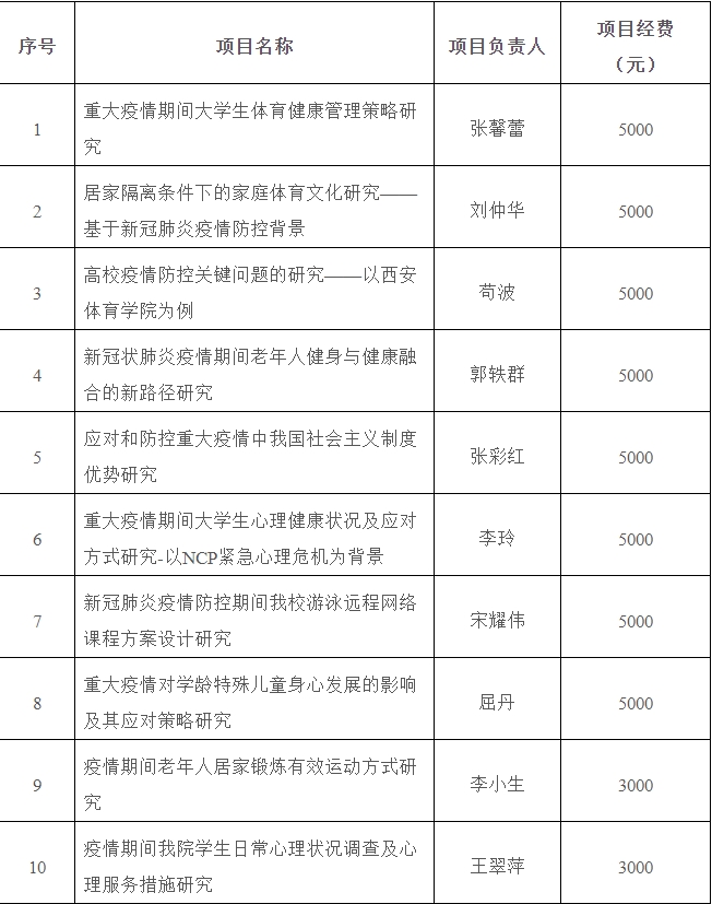 科研优势助力抗疫。本着发挥学科专业特点和优势,为抗击疫情贡献beat365力量,在校领导的带领下,科研处制定了beat365新冠肺炎疫情防控研究工作方案,设立了“beat365中文官方网站院管课题新冠肺炎疫情防控专项项目”,积极组织广大教师围绕抗击新冠肺炎相关问题开展科学研究工作。在各二级学院的广泛宣传与通力协助下,共计申报项目26项。经专家组认真评审,“新冠状肺炎疫情期间老年人健身与健康融合的新路径研究”、“重大疫情期间大学生心理健康状况及应对方式的研究”等10个项目获准立项。目前,各项研究工作正在扎实有序进行,力争为打赢疫情防控阻击战贡献beat365力量。