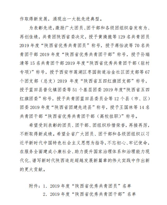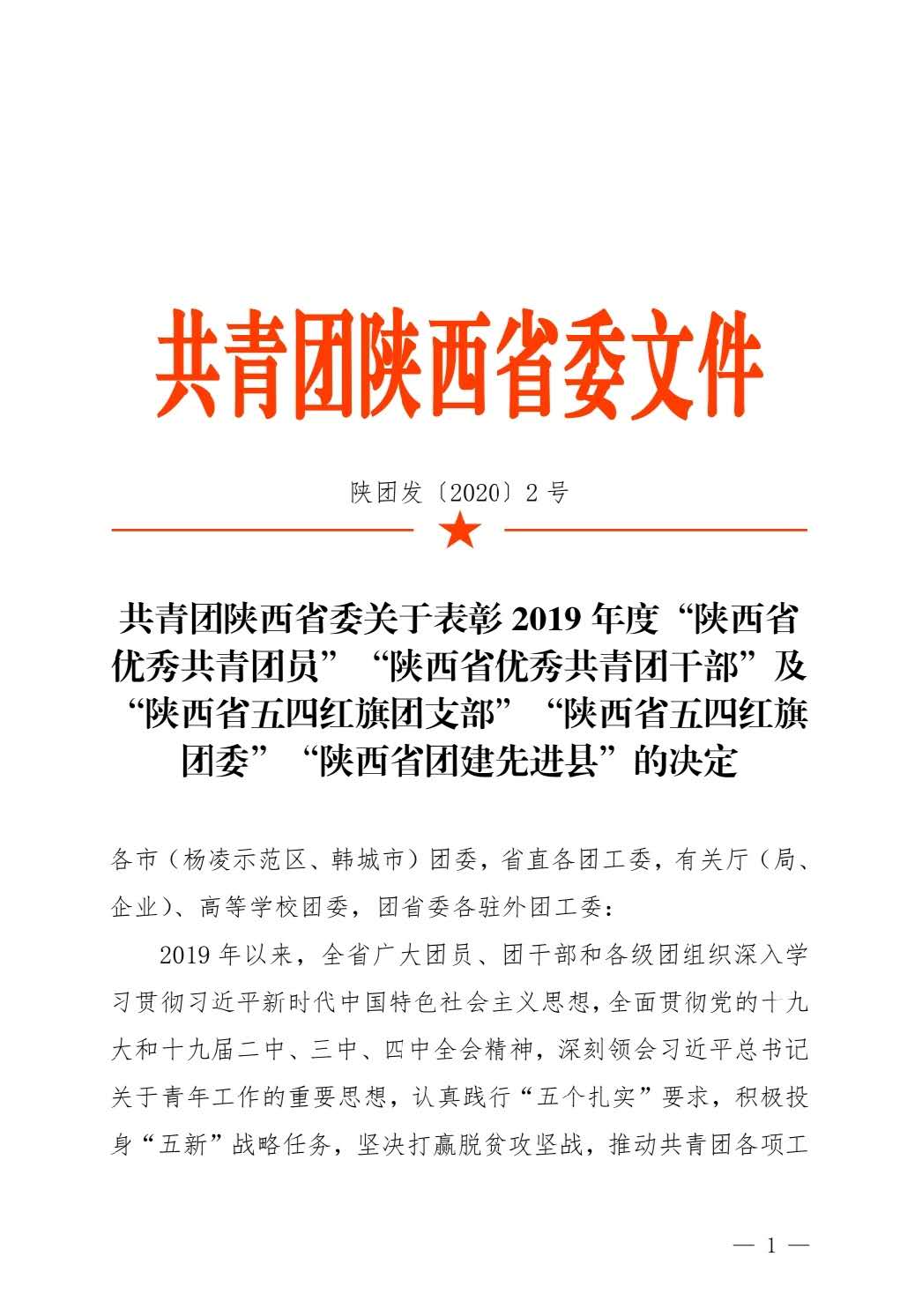 本网讯 近日,共青团陕西省委发布《共青团陕西省委关于表彰2019年度“陕西省优秀共青团员”“陕西省优秀共青团干部”及“陕西省五四红旗团支部”“陕西省五四红旗团委”“陕西省团建先进县”的决定》,beat365团委获“陕西省五四红旗团委”称号,党政办秘书科副科长吕欣徽获“陕西省优秀共青团干部”称号,足球学院学生曾玉韬获“陕西省优秀共青团员”称号。