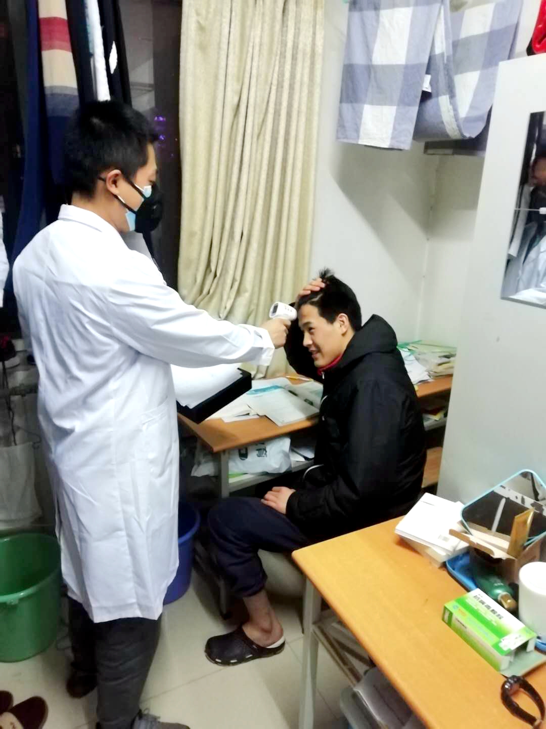 队医李梧桐大年初二就放弃了休假,克服困难回到学校,以战斗状态迅速投入到疫情防控工作中,24小时在岗值守。每天中午,李梧桐在餐厅门口为运动员测量体温,检查口罩等,每晚深入运动员宿舍逐人测量体温,把疫情风险降到最低。