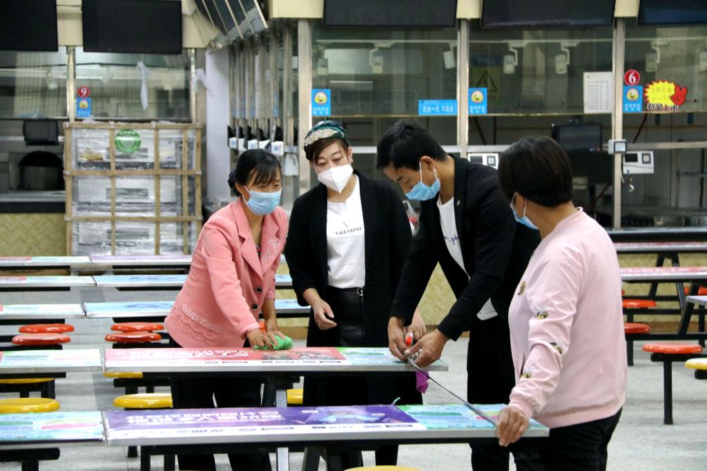 黄道峻(左二)、朱元利(左三)、李富生(右二)听取学校餐厅演练情况汇报