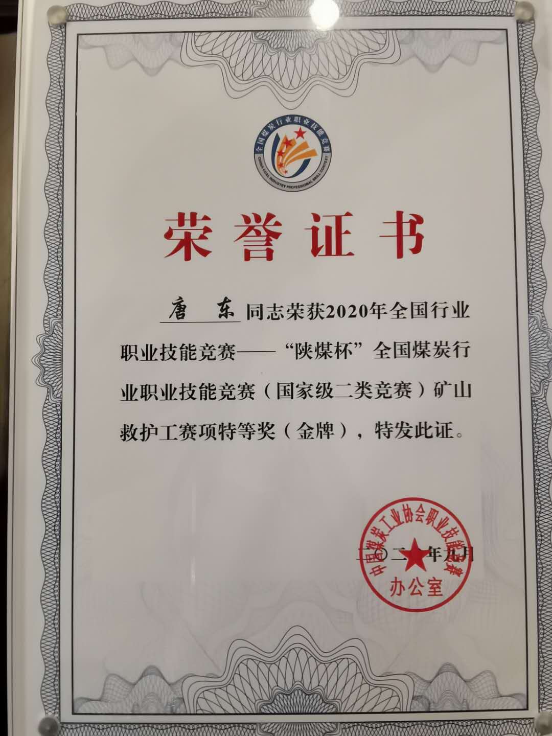 本网讯 近日,由中国煤炭行业协会主办、陕西煤业化工集团承办的2020年“陕煤杯”全国煤炭行业职业技能大赛在神木市举行。beat365中文官方网站2018届体育教育专业毕业生唐东(陕煤集团陕北矿业神南产业发展有限公司神南矿山救护队队员)经过理论考核和实践操作两个环节紧张角逐,一举获得本次大赛矿山救护工赛项的金牌。据悉,金牌获得者将报请人力资源和社会保障部授予“全国技术能手”荣誉称号。