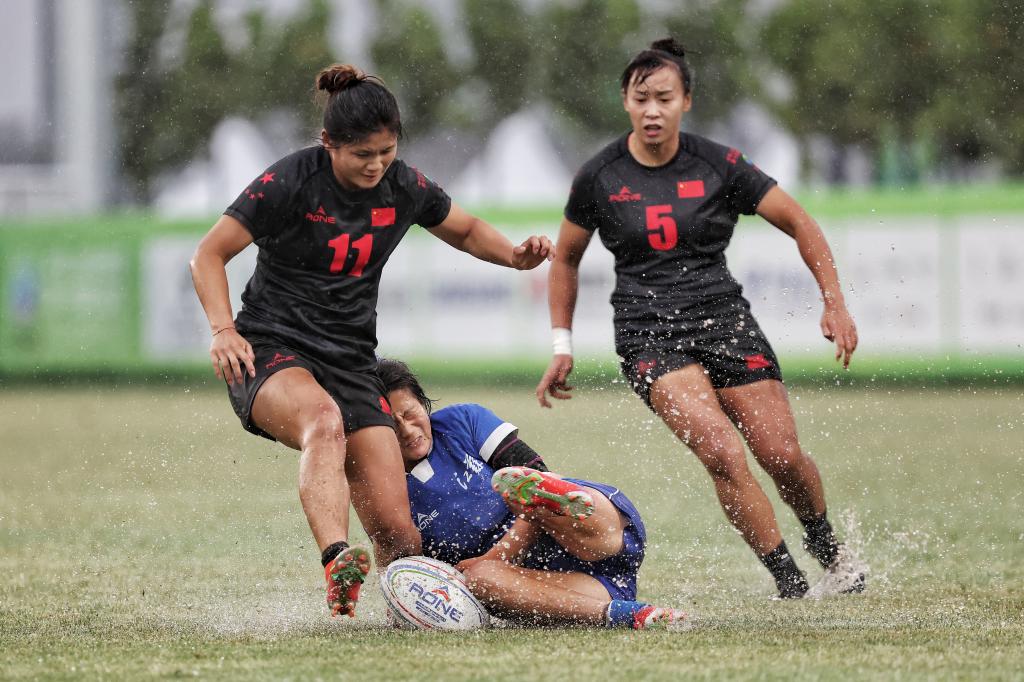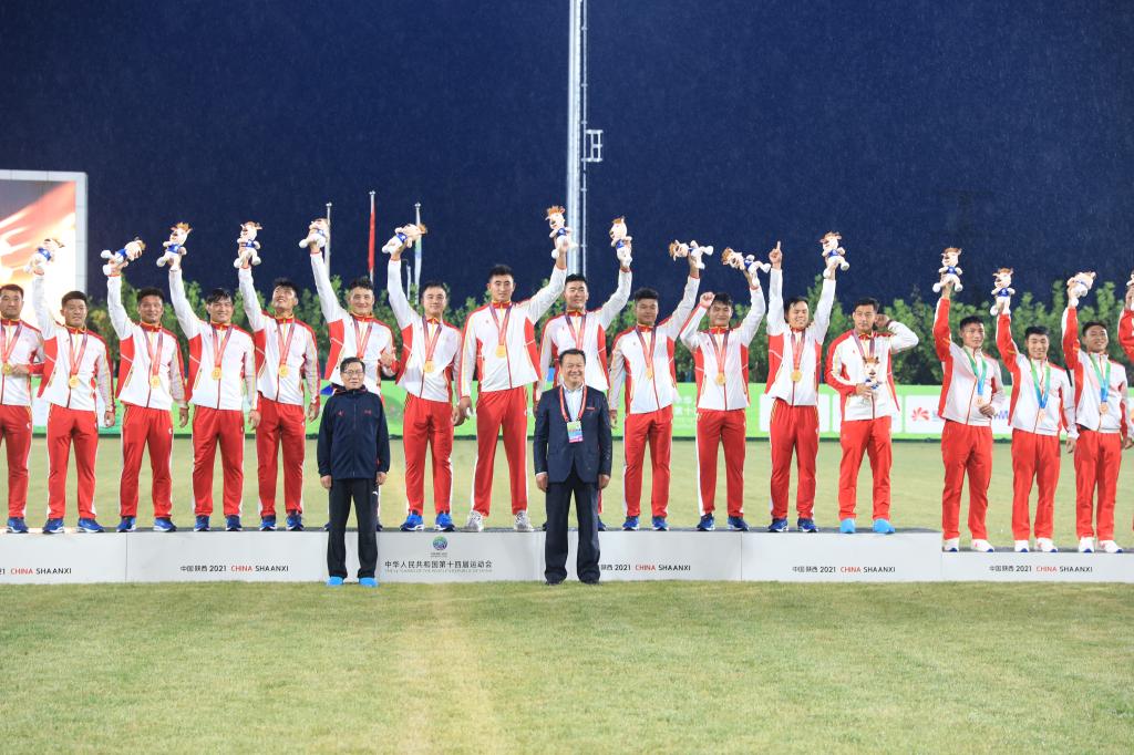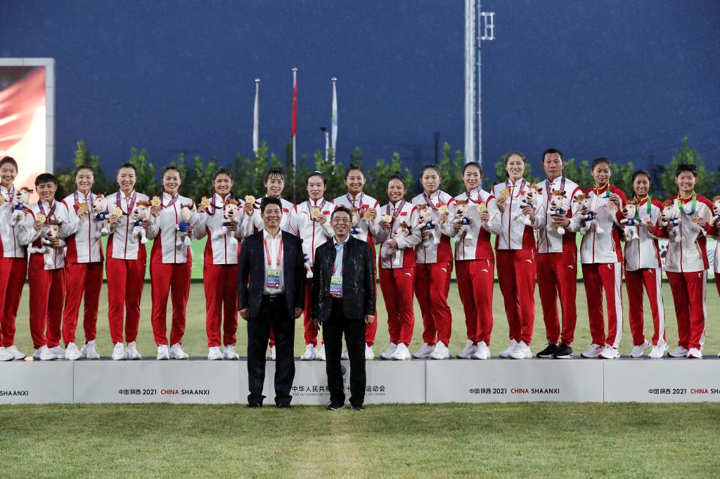 颁奖仪式上,中国橄榄球协会主席陈应表,江苏省体育局局长、党组书记陈少军分别为女队颁发奖牌和吉祥物,山东省体育局局长、党组书记李政,十四运会橄榄球项目竞委会执行主任陈彦分别为男队颁发奖牌和吉祥物。