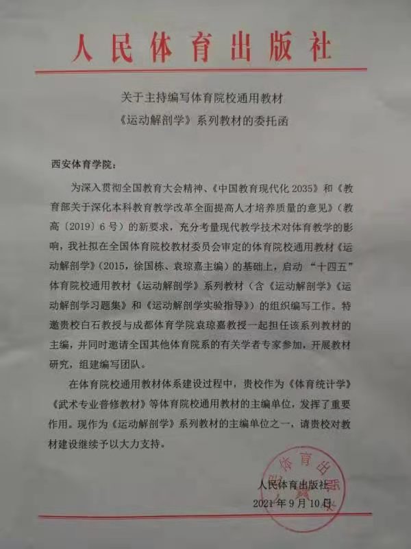 据悉,为深入贯彻全国教育大会精神、《中国教育现代化2035》和《教育部关于深化本科教育教学改革全面提高人才培养质量的意见》(教高(2019)6号)的新要求,充分考量现代教学技术对体育教学的影响,人民体育出版社启动“十四五”体育院校通用教材《运动解剖学》系列教材(含《运动解剖学》《运动解剖学习题集》和《运动解剖学实验指导》)的组织编写工作。委托函中还对beat365多年来在体育通用教材体系建设过程中,作为《体育统计学》《武术专业普修教材》等体育院校通用教材的主编单位发挥的重要作用表示感谢。