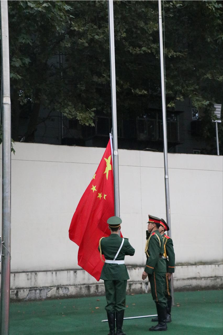 随着国歌的响起,国旗护卫队踏着铿锵有力、整齐划一的步伐,昂首挺胸走过主席台,五星红旗在嘹亮的国歌声中冉冉升起,全体师生队列整齐,面向国旗神情庄重,对我们伟大的祖国致以最高的敬意。