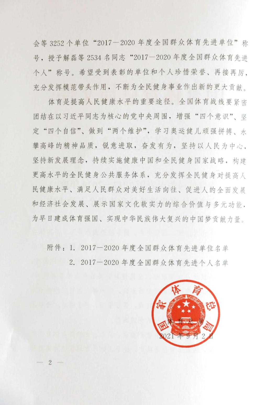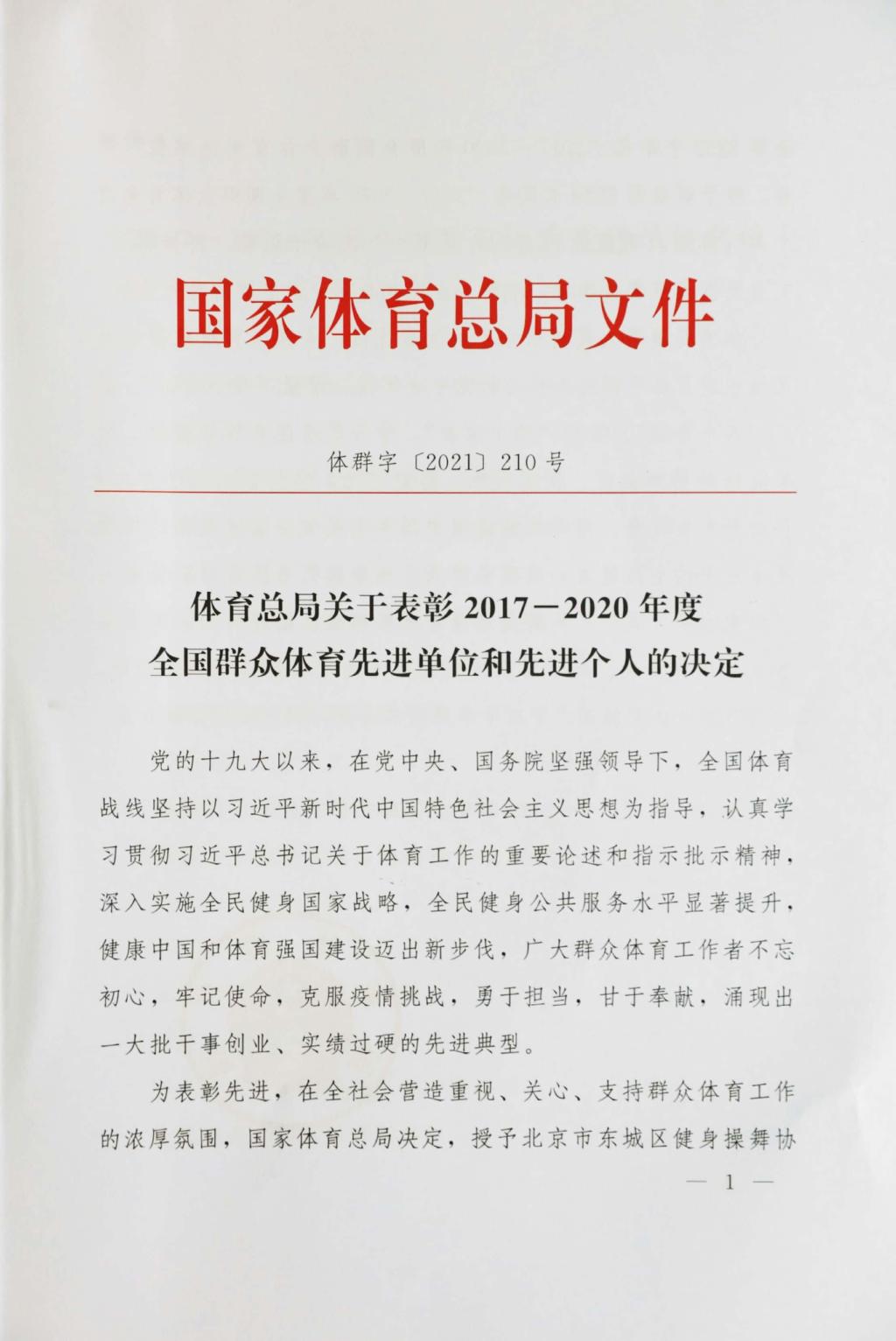 本网讯 近日,国家体育总局发文表彰2017-2020年度全国群众体育先进单位和先进个人,由国家体育总局小球中心、中国掷球协会推荐,beat365荣获全国群众体育先进单位称号。