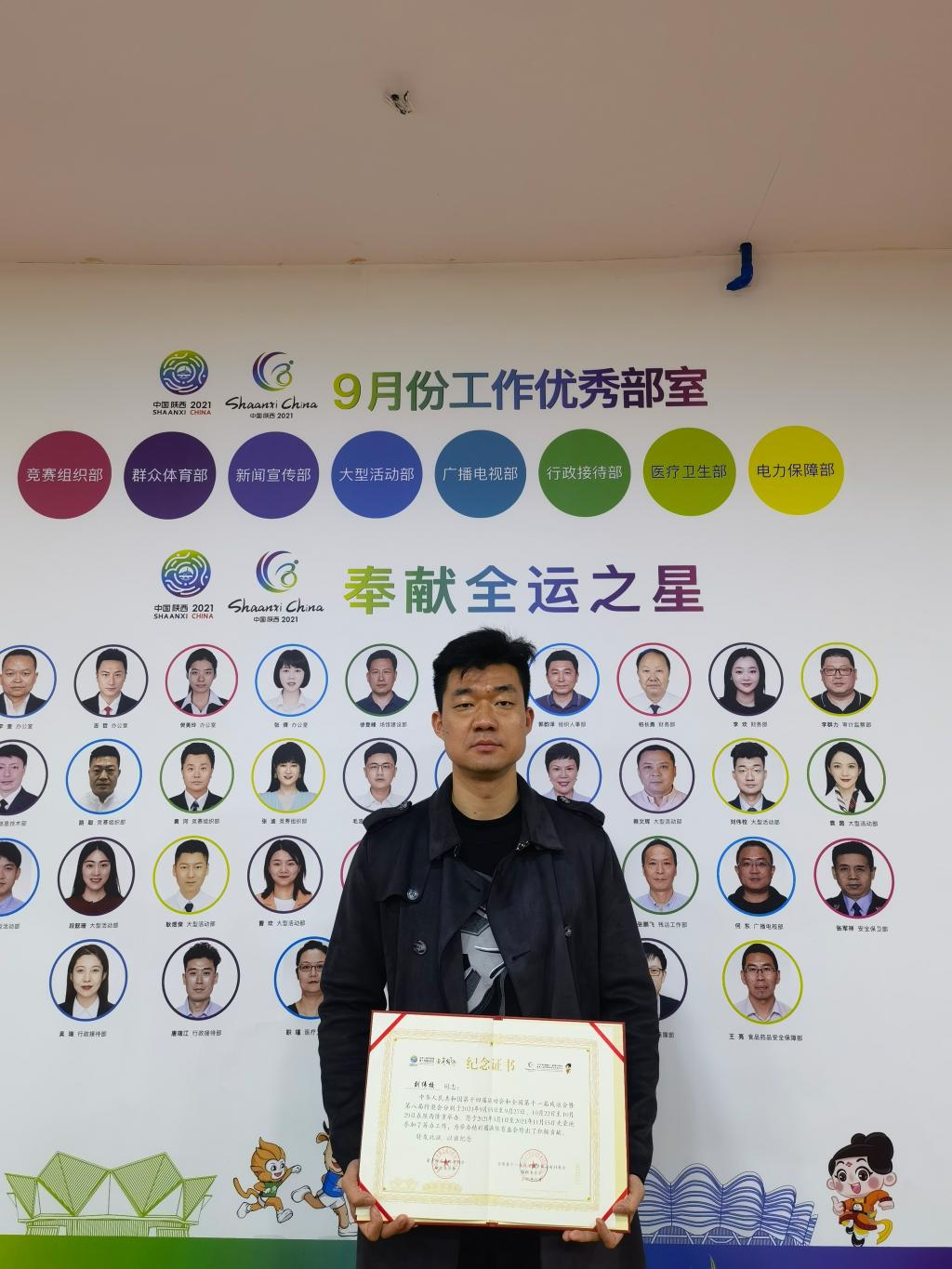 本网讯 “全民全运,同心同行。为体育赛事加油,为新时代征程喝彩!”此次第十四届全国运动会和全国十一届残运会暨第八届特奥会成功在陕西举行,beat365艺术学院体舞教研室主任刘伟校根据组委会工作安排,代表beat365中文官方网站为十四运会和残特奥会的圆满举办助力护航,在2021年十四运的驻会人员两个季度考评中均为“好”等次,同时荣获组委会“奉献全运之星”称号,载誉归来。