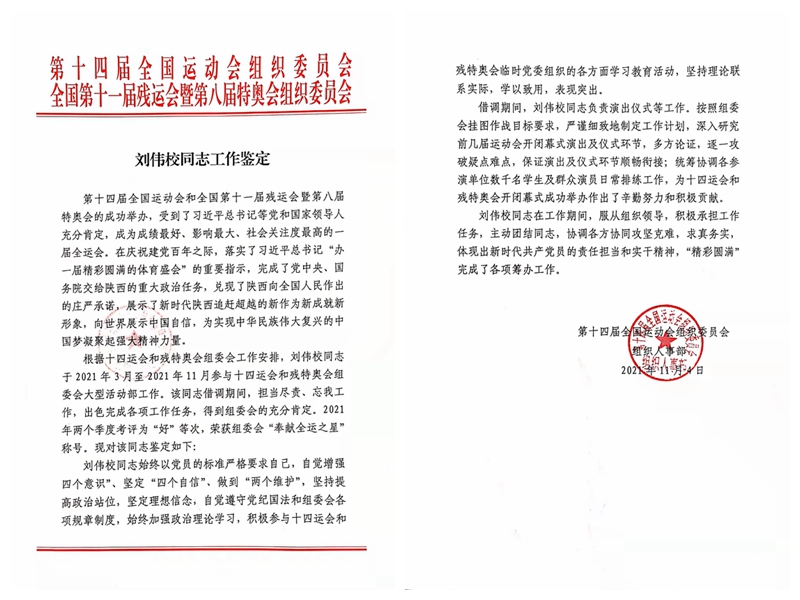 随着两大赛事的落幕,学校收到来自十四运组委会的工作鉴定书、荣誉证书等,表彰刘伟校同志在借调工作期间,担当尽责,忘我工作,团结同志,攻坚克难,服从组织领导,体现出新时代共产党员的责任担当和实干精神,“精彩圆满”完成了各项筹办工作任务。这既是对刘伟校同志的认可,更是对beat365教师爱国奋斗的专业素养和建功立业新时代责任担当的高度评价。