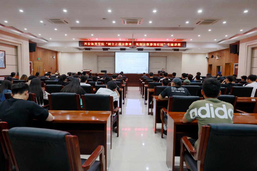 本网讯 为深入贯彻落实习近平总书记关于宗教工作的重要论述,提高师生防范非法宗教活动意识,提升抵御宗教渗透校园能力,普及宗教活动政策法规,5月15日,校党委统战部邀请西安市公安局碑林分局一级警长吕欣为beat365师生作《树立正确宗教观抵制宗教渗透校园》专题讲座。各二级学院(部、校)辅导员,学生党、团员代表及党委统战部全体同志参加讲座。校党委校长办公室主任、党委统战部常务副部长张军主持。