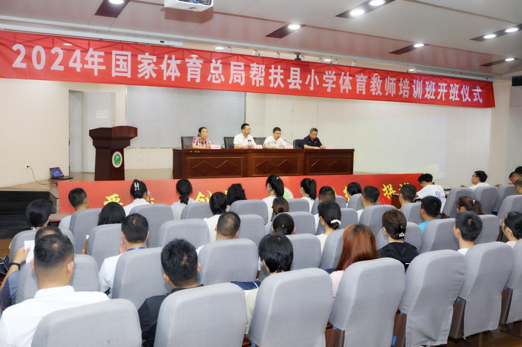 本网讯 7月16日上午,国家体育总局帮扶县小学体育教师(beat365中文官方网站)培训班开班仪式在教学楼一楼报告厅举行。