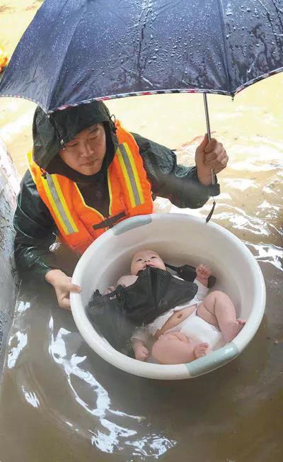 图为2020年6月27日,在宜昌市伍家岗区,消防员用水盆将3个月大的婴儿安全转移