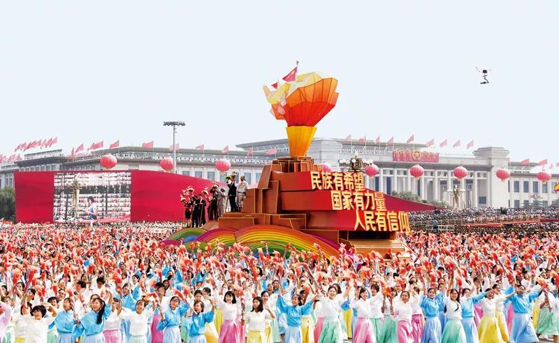 2019年10月1日,庆祝中华人民共和国成立70周年大会在北京天安门广场隆重举行。这是群众游行中的“凝心铸魂”方阵