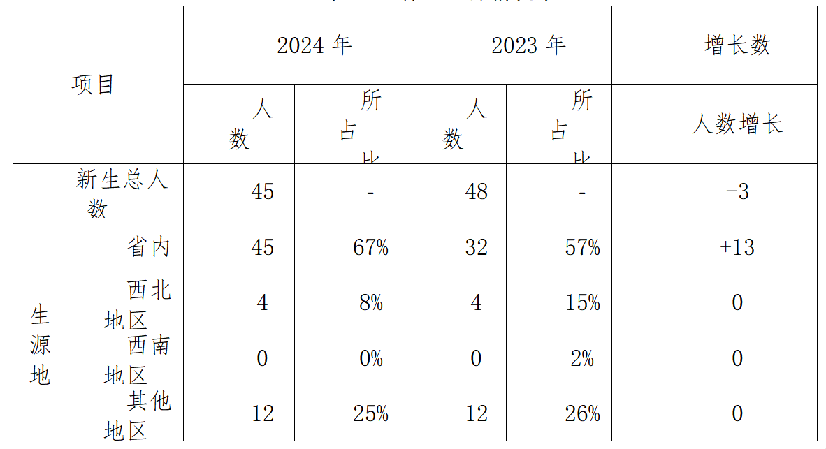 2.招生规模:2024年,学校共录取全日制新生45人,比2023年减少3人。按生源地分,新生生源地为省内:45人。具体情况见下表: