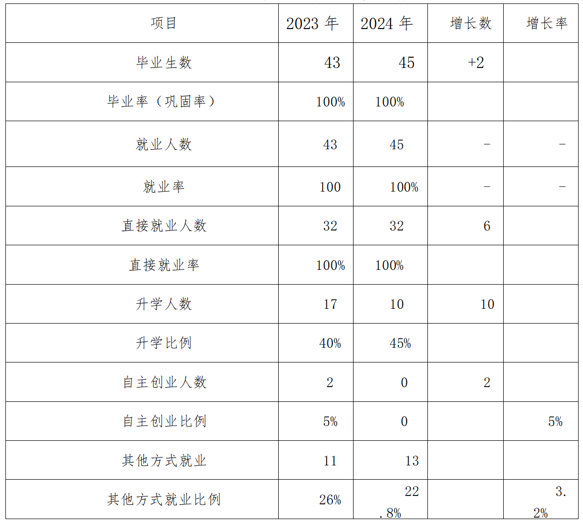 2024年应届毕业生45人,就业学生数为45人,平均就业率为100% 。直接就业人数32人,对口就业率74.4%。