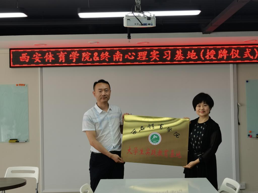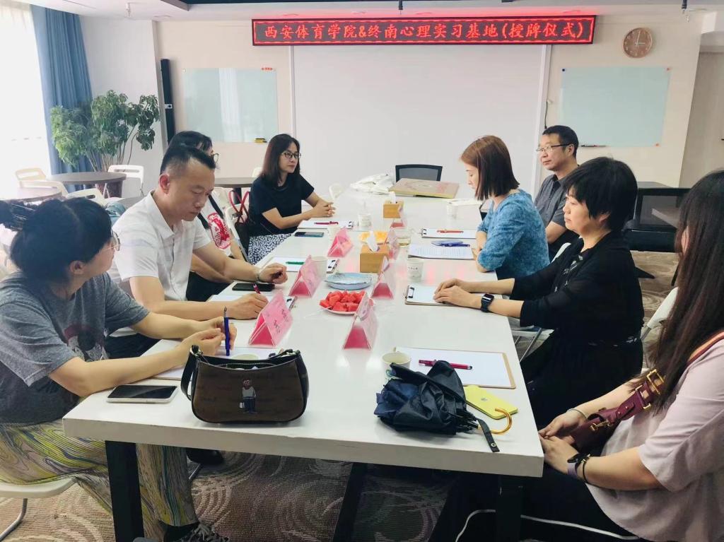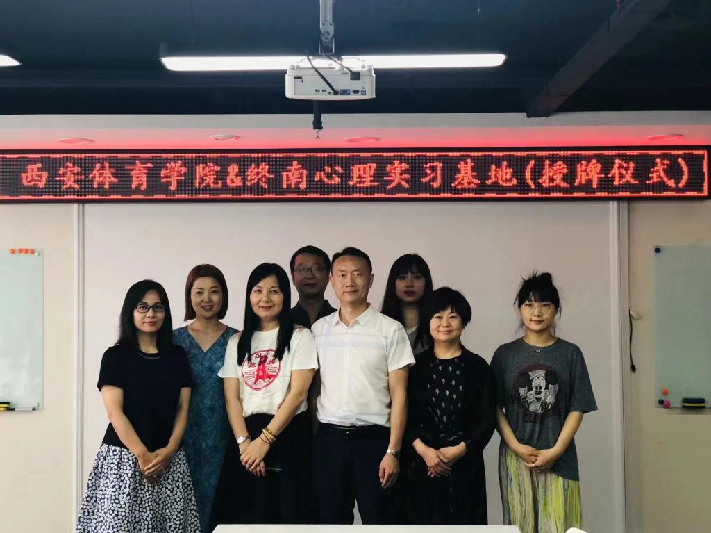 2022年6月2日,运动与健康科学学院与陕西终南心理咨询有限公司在终南心理培训大厅举办了简短而隆重的应用心理学专业教学实践基地授牌仪式。参加本次授牌仪式的有运动与健康科学学院院长刘涛教授,心理学教研室主任解缤教授,支部书记李晶博士,心理学教研室王超老师,以及运动与健康科学学院学工办主任苏菲老师,辅导员杨子欣老师;终南心理的负责人周红霞老师,项目部总监钟妍、课程培训部候渊翰等工作人员参加了授牌仪式。