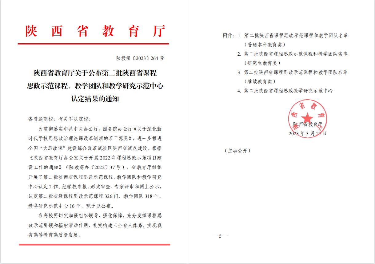 另外,由我院刘远新教授领衔的课程《慢性病运动康复》及所属教学团队同时被认定为第二批陕西省课程思政示范课程和教学团队(研究生教育类)。