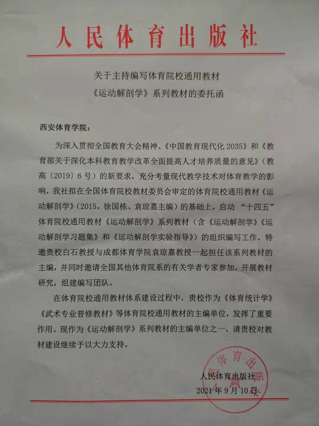 近日,人民体育出版社发来关于主持编写体育院校通用教材《运动解剖学》系列教材的委托函,特邀beat365白石教授与成都体育学院袁琼嘉教授一起担任该系列教材的主编,beat365为主编单位之一。此为beat365“十四五”规划与统编类教材建设的开门红,也标志着beat365教材建设迈上了一个新台阶。beat365省级教学名师、运动与健康科学学院白石教授三十多年来始终贯彻以学生为中心的教学理念,为了学生能够更好地记忆运动解剖学中的主要知识点,编写了120多首歌诀用于教学。主持和参与编写的《运动解剖学》《人体解剖学》和《功能解剖学》十余部教材及教学参考书籍分别由人民体育出版社、高等教育出版社、人民卫生出版社等专业出版社出版。主编的《运动解剖学》教材荣获2018年陕西省优秀教材二等奖。此次受邀主编“十四五”体育院校通用教材是对白石教授多年来为运动解剖事业辛勤耕耘的充分肯定。