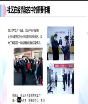为了保证课堂教学效果,克服理论课程枯燥无味,学生不感兴趣等问题,结合第一讲“导论”提纲挈领介绍课程主要内容的授课需求,在开学第一讲中巧妙结合当下热点问题,以“抗击疫情—社区在行动”为主题,以视频导入的方式,结合我国基层社区的抗疫经验与伟大成就,介绍社区在新冠疫情防控中的重要作用,进一步引出社区概念、社区体育发展动因、现状及趋势等知识内容。主动拓展教学资源,在教材的基础上,从知网、学习强国、相关专业网站上搜索社区体育典型案例与前沿研究成果,让学生建立起对社区体育知识体系与理论框架的认知。在学生作业完成过程中及时指导,及时调整教学内容,优化教学手段,提升教学满意度。