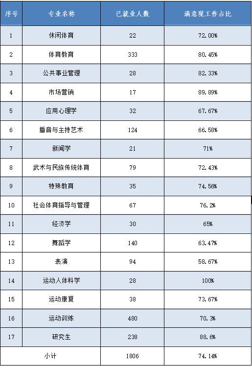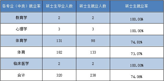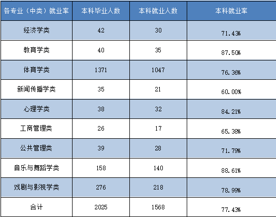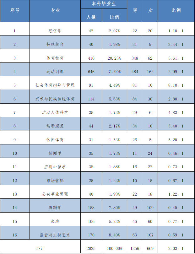 涉及16个本科专业(方向),13个硕士专业(方向)。本科毕业生人数超100人的有6个专业(体育教育专业、运动训练专业、武术与民族传统体育专业、舞蹈学专业、表演专业、播音与主持专业)。本科专业涵盖新闻学、经济学、心理学、艺术学、管理学等学科门类,研究生专业涵盖体育教育训练学、体育管理学、应用心理学等学科门类。