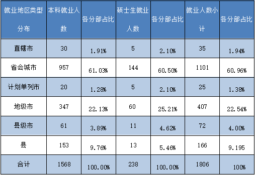 在已就业的1806名本科、硕士毕业生(不含升学、出境、自主创业、国家基层项目) 中,按照就业地区类型分布具体分析如下表。