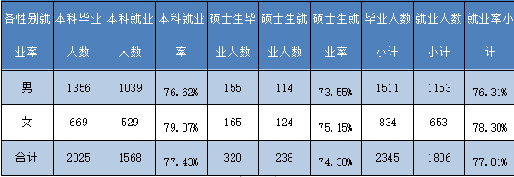 在已就业的1658名本科、硕士毕业生(不含升学、出境、自主创业、国家基层项目) 中,留陕西省就业1165人,占总就业人数的70.27%;到山西省就业51人,占总就业人数的3.08%;到山东省就业55人,占总就业人数的3.32%。