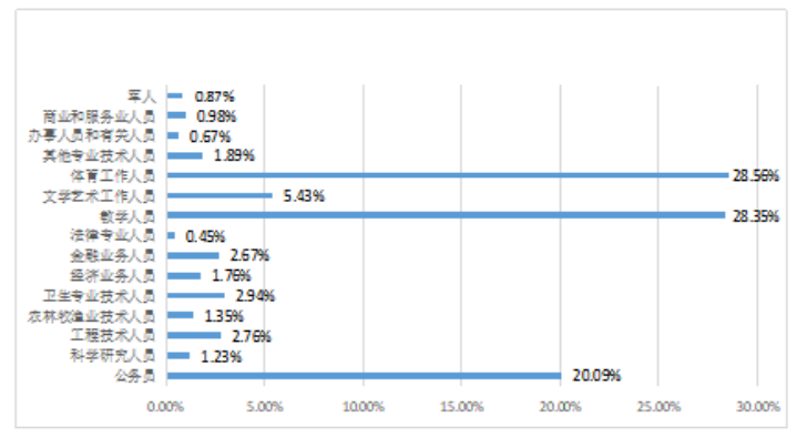 在就业职位意向的选择上,学生意向较高的是“体育工作人员”(28.56%);“教学人员”(28.35%);“公务员”(20.09%)等。