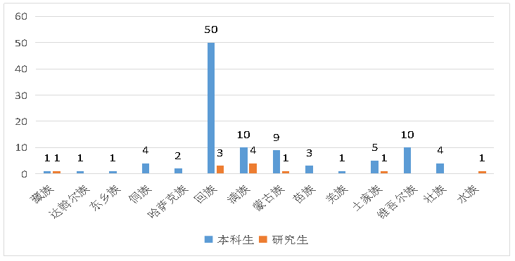 2021届共有少数民族本科毕业生101人,占本科毕业生总人数的4.99%,分别来自13个少数民族。人数较多的是回族、满族和维吾尔族。汉族本科毕业生1924人。