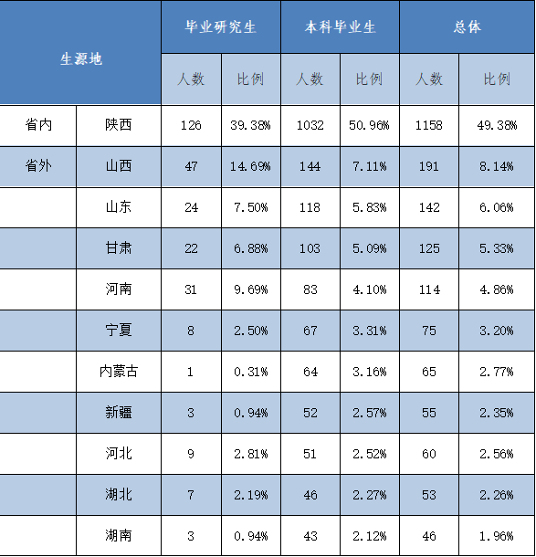 2021届不同学历阶段的毕业生来自全国29个省市区(港澳台除外),共有2345人,其中省内生源有1158人,省外生源共1187人,人数较多的省份是陕西省(1158,49.38%)、山西省(191,8.14%)和山东省(142,6.06%)。