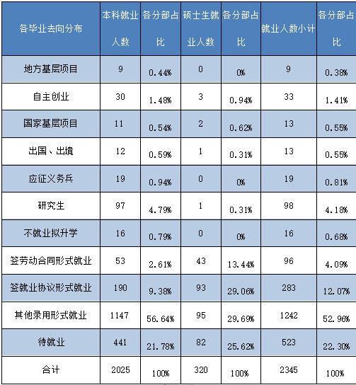 按照就业去向分布具体分析如下表