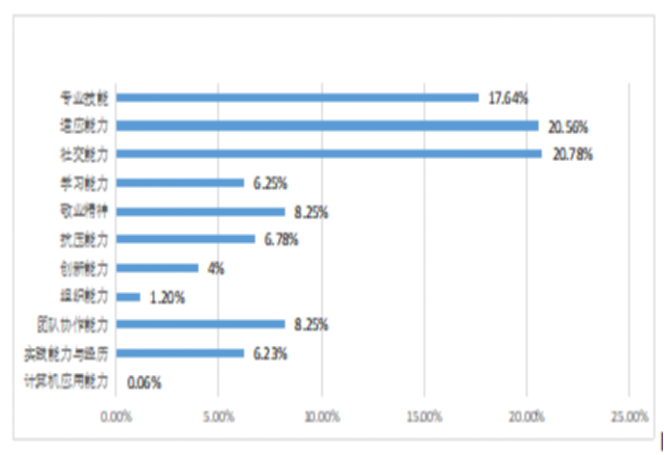 用人单位对本校毕业生在工作中的能力评价如下图所示:其中用人单位认为本校毕业生的“适应能力”(20.56%)、“社交能力”(20.78%)和“专业技能”(17.64%)这三项素质比较强;而“计算机应用能力”和“组织能力”则相对较为薄弱,需进一步加强。
