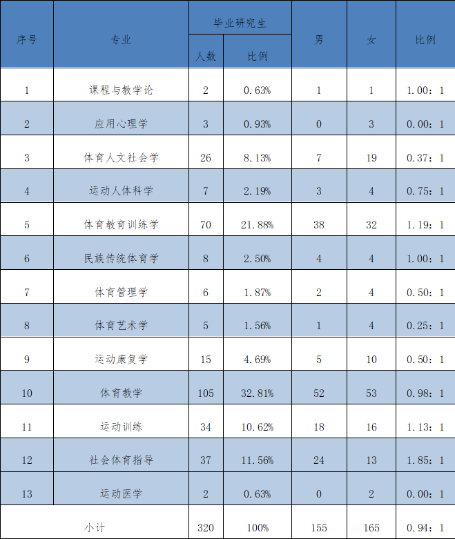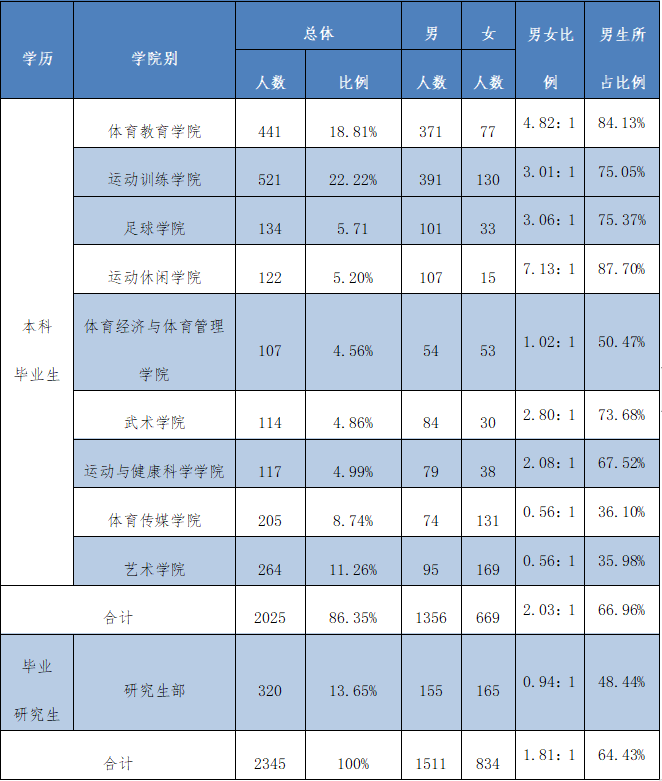 从表中可知,男生共有1511人,占总人数的64.43%,女生共834人,占总人数的35.57%,男女比约为1.81:1。其中七个学院和研究生部的男生比都超过50%,分别是体育教育学院、运动训练学院、足球学院、运动休闲学院、体育经济与管理学院、武术学院、运动与健康科学学院。