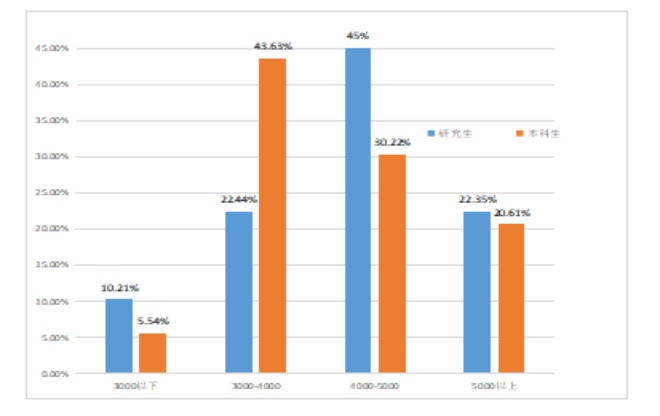 对beat3652021届毕业生的薪资水平进行了电话访谈,随后对数据进行统计,本科毕业生在3000-4000元占比最多,毕业研究生的薪资在4000-5000的占比最多,毕业研究生的薪资在4000以上的要多于本科毕业生,详情如下图所示: