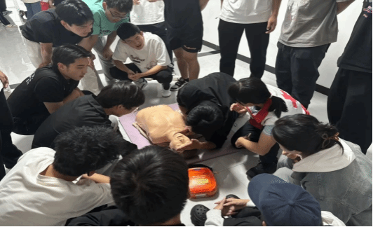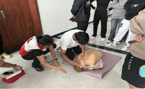 随后各个组别的志愿者用模拟假人展示急救流程,志愿者们听得十分认真并在现场进行了练习。本次活动从理论讲授到实际操作展示,再到模拟演练,每一个环节都经过精心设计,既符合科学性又注重实用性,目的是使志愿者们学习急救技能,提高个人的自救与互救能力。