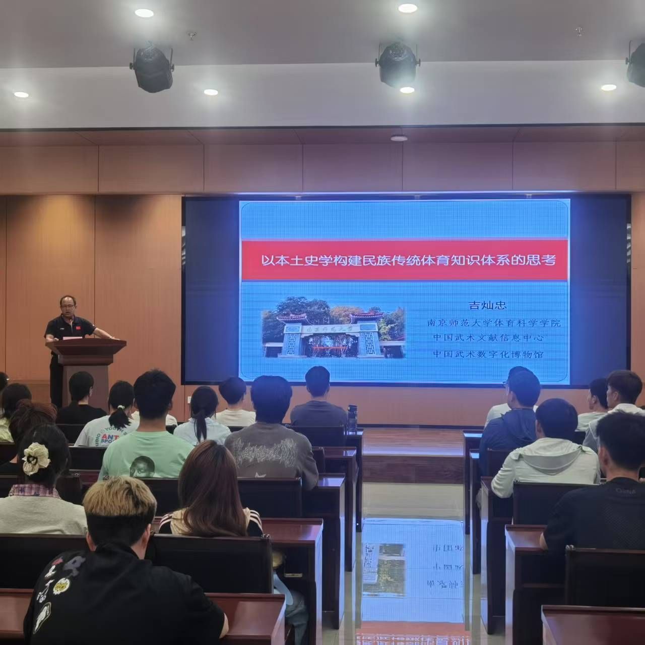 5月28日下午,中国武术文献信息中心研究员、中国武术数字化博物馆专家、南京师范大学体育科学学院副院长、博士生导师吉灿忠教授应邀出席beat365中文官方网站2025年系列学术讲座(第三场)活动,为beat365百余名师生进行“以本土史学构建民族传统体育知识体系的思考”为题的专题讲座,专题讲座在鄠邑校区教学综合楼541会议室举行。武术学院副院长李正恩主持学术讲座。