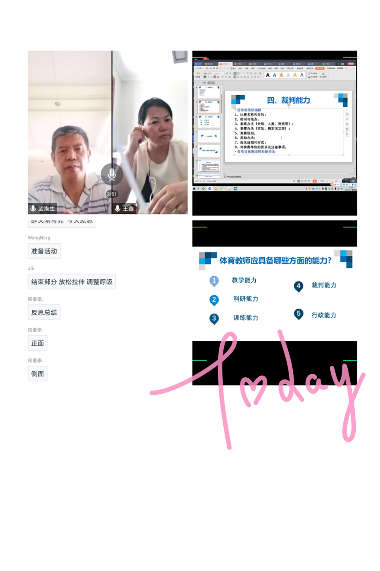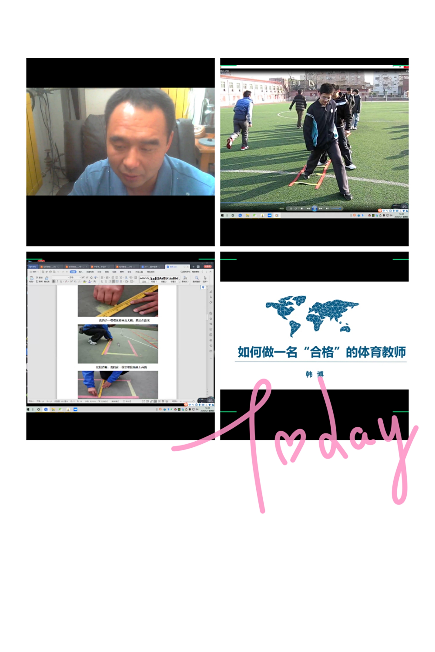 参加会议的有运动训练学院院长武洛生、运动训练学院党委书记王鑫、年级辅导员以及2020届全体学生。报告会上韩博运用实例,深入简出为学生讲授了《如何做好一名合格的体育教师》,从体育教师应具备的教学、科研、训练三大能力为切入点,着重讲解了中学体育教学的设计概念、主要元素、不同要素的写法及案例分析,同时为学生解答了中学体育课堂设计中常见的问题,学生在线上互动积极。通过本次线上实习讲座,使每位同学对此次教育实习有了更加清晰明确的认识。