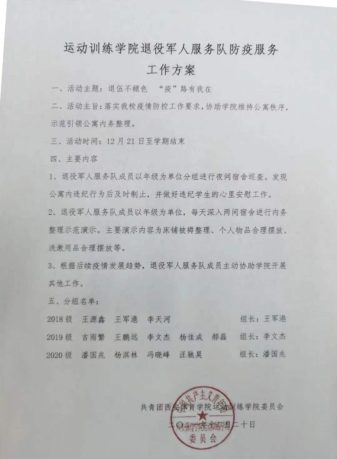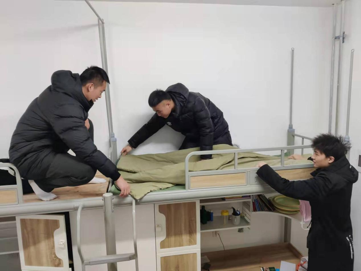面对突如其来的疫情,为了落实beat365疫情防控工作要求,协助学院维持公寓秩序,示范引领公寓内务整理,运动训练学院还成立了以退伍复学学生为主体的退役军人志愿服务队。退役军人服务队每晚协助辅导员对宿舍环境卫生进行检查,指导学生宿舍的内务。