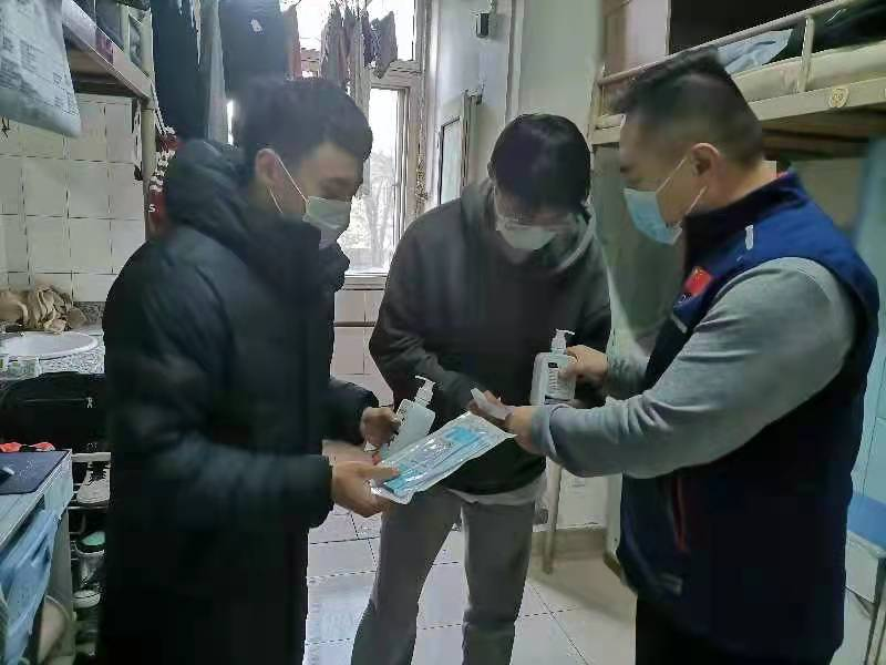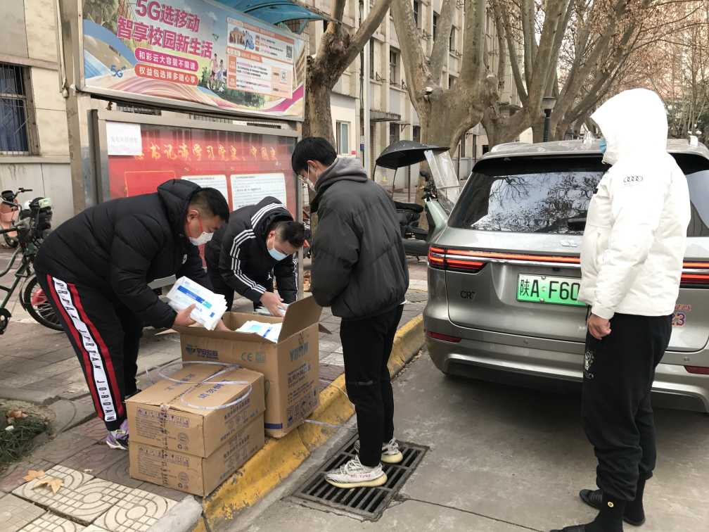 运18年级主任张即帅、运20辅导员南海涛为学生分发捐赠防疫物资