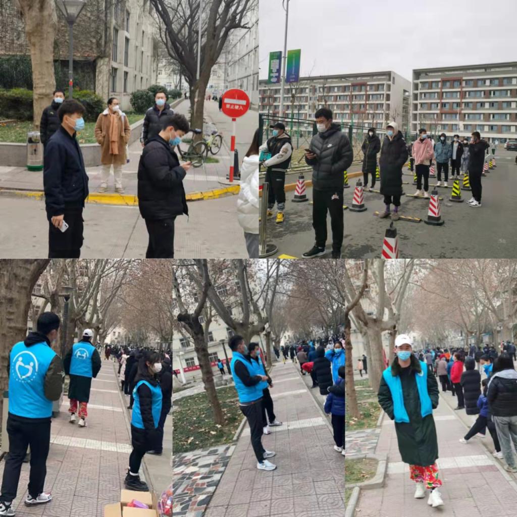 核酸检测现场,积极配合校医院工作人员,引导学生有序排队,提前准备好健康码、保持一米距离,统计检测人数。在校园开展巡逻,对聚集学生进行疏散,对未佩戴口罩学生进行劝导。