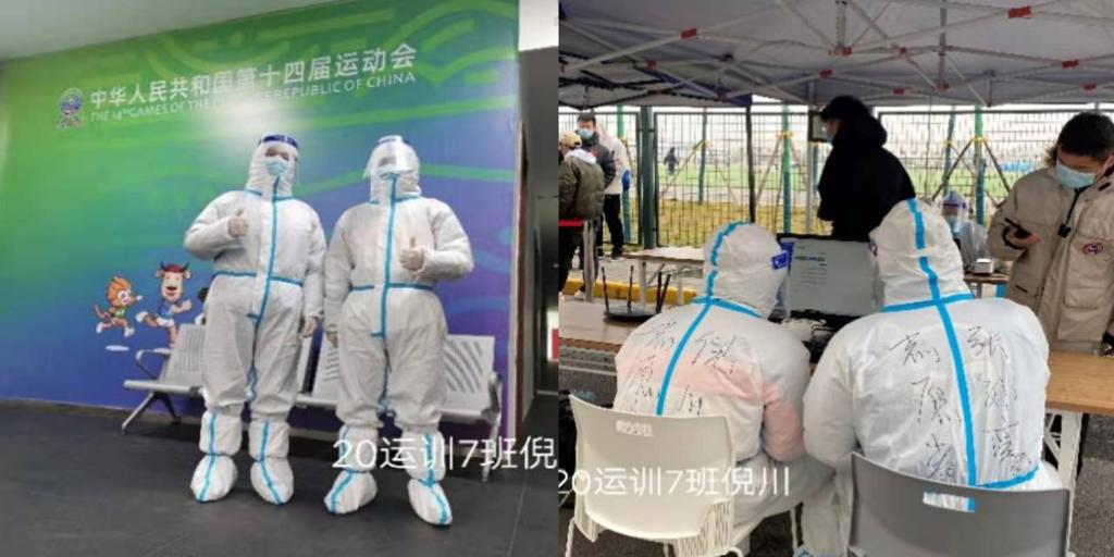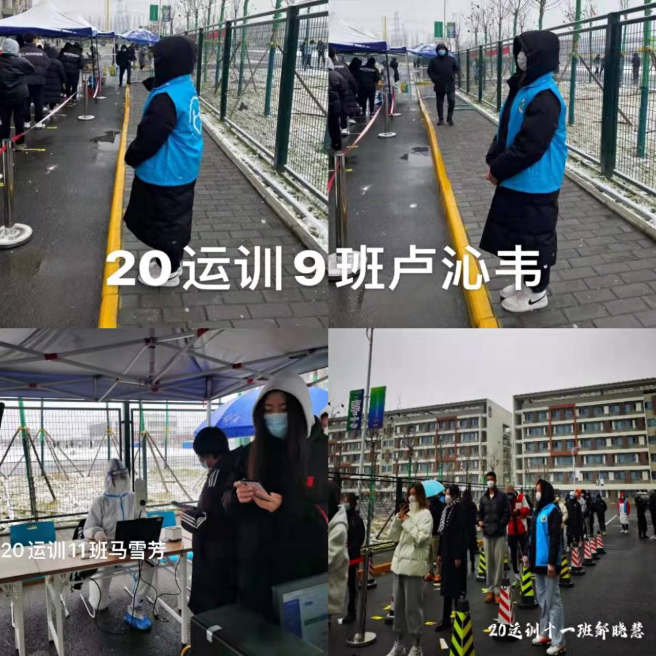运训2020级7班的张孙豪、倪川同学,9班的卢沁韦同学,11班的马雪芳、宗星星、吴桐欣、邹晓慧同学,在核酸检测时的志愿服务内容是协助医护人员核酸检测,维护检测现场秩序。