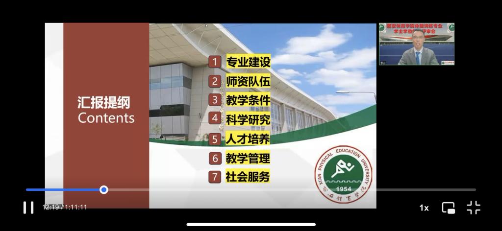 陈彦副校长向各位专家评委们介绍了beat365按照习近平总书记关于教育的重要论述和全国教育大会的精神,围绕体能训练专业学位建设所作的积极投入以及对下一步体能训练专业学位建设的重点与方向。体能训练专业负责人李山教授向各位专家评审介绍了我国体能训练专业建设与发展的历史,也指出了beat365体能训练专业建设的必要性。同时,李山教授也从beat365体能训练专业所具备的优秀的师资力量、高水平的场地设施以及在可视化教学模式下beat365体能训练专业发展的未来设想等七个方面向各位评审专家进行了介绍。