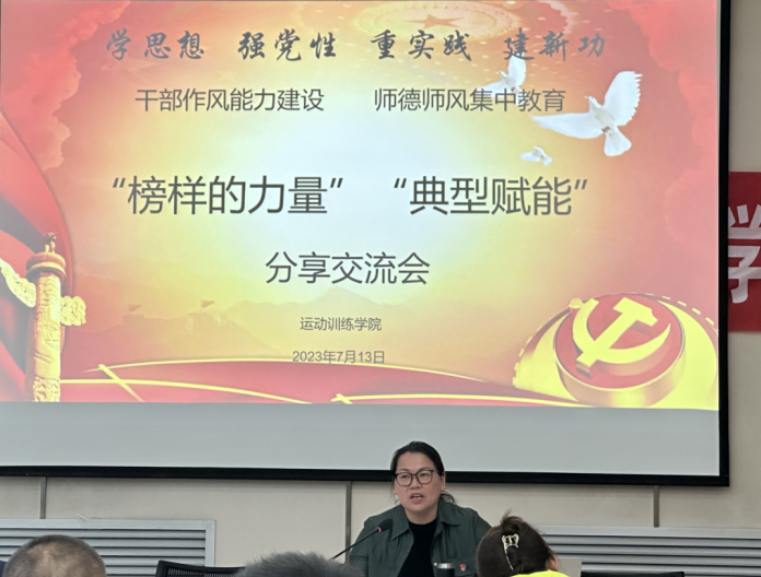 高山仰止,方知才疏,三人同行,觉左右为师。为深入学习贯彻习近平新时代中国特色社会主义思想,贯彻落实习近平总书记关于教育的重要论述、立德树人的根本任务,充分发挥教师的示范引领作用,更好加强师德师风建设,促进教师的专业养成,同时也为青年教师提供学习交流的机会。7月13日下午运动训练学院开展“榜样的力量”、“典型赋能”交流分享会。运动训练学院领导班子、全体教师出席了本次活动。会议由党委书记王鑫主持。